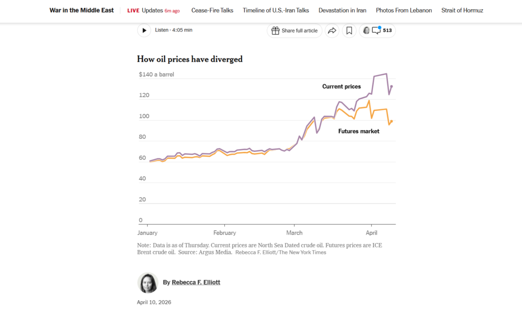 This timing-driven shortage is clearly visible in the structure of the oil market, which has moved into extreme backwardation. Dated Brent — the key benchmark for physical cargo surged to around $144 per barrel compared to brent futures at $109, briefly exceeding previous cycle highs, before easing to roughly $126 by the end of the week. Even after the pullback, it remains more than $20 above June Brent futures, which continue to trade closer to the mid-$90s range. This spread is not a technical anomaly — it reflects the premium attached to immediate availability in a system where supply cannot be replenished quickly.