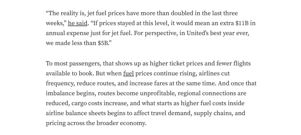1) If the war continues or no war but the strait remains closed/ hefty fees charged, airline industry will feel the burn due to increased jet fuel prices. Jet prices have already moved sharply higher and EU airline industry warns of fuel shortages within 3 weeks if strait remains closed. The issue isn’t just price its availability. Particularly Europe imports around 50% of jet fuel from Persian Gulf, in case of rising costs and potential shortages we should see the airline industry suffering in equity markets. Good buying opportunity but will take a while to soar back to its previous levels as summer vacations are impacted from gasoline and jet fuel prices for the year.